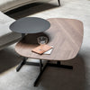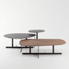 The Kumo 120 coffee table is one in a series of asymmetrical low tables with metal feet, which are designed to be used together and which can be freely combined to create contrasting sets of tables. Kumo 120 is available with a veneered Canaletto Walnut or Coal Oak top, ceramic tops with marble finishes, and metal feet in a range of painted and metallic finishes. Made in Italy.